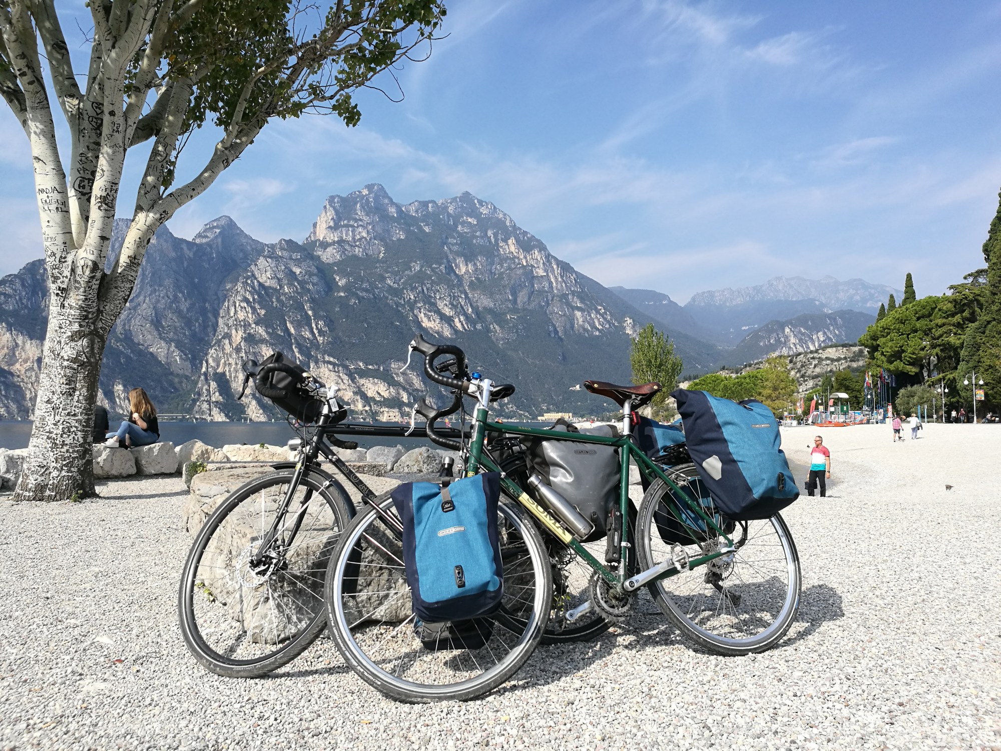 Now, some uncouth locals speak of the Lago as shaped like a “cock and balls”. Sticking (if we must) with this vernacular, then consider our route from Peschiera del Garda in the south (right testicle) to Torbole in the north (the ‘nob’), as a steady 10 hours of pedalling. Naturally. we took a break – in beautiful Torri del Benaco – for our first camp-out of the trip. It would appear Peschiera del Garda is a bit of a fun-park for north-of-the-border tourists – indeed AW was more often than not spoken ‘at’ in Deutsch. This made AW appear an even greater imbecile than that when spoken to in Italian, as he was considered incapable of conversing in his native language as well. Fortunately there were sights aplenty to distract us from such minor distractions. For instance, the Lago is home to possibly the saddest theme-park and some of the most violently randy swans in Europe, while Torbole (you’ll be pleased to hear) is very picturesque, tucked right in the lake’s apex (‘nob’), surrounded by the most magnificent cliffs. You can see some ‘tunnel-vision’, at the bottom of the page.